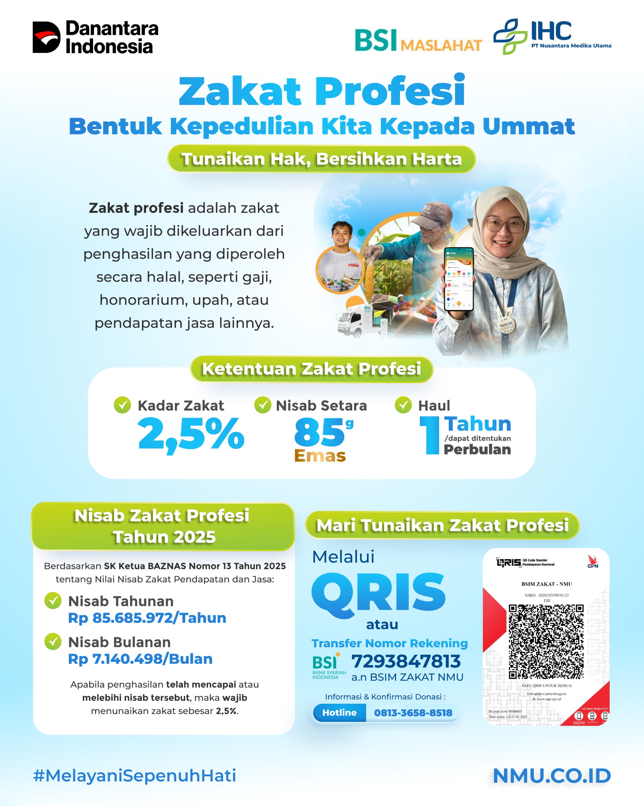 Mari tunaikan zakat profesi melalui BSI Maslahat bersama IHC PT Nusantara Medika Utama.
