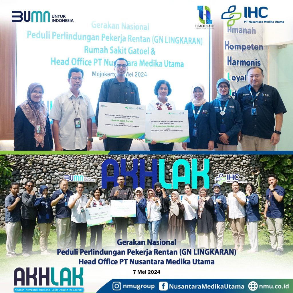 Dalam rangka hari buruh serta sebagai wujud dukungan dan bentuk kepedulian Perusahaan dalam meningkatkan kesejahteraan sosial masyarakat terhadap pekerja rentan, maka PT Nusantara Medika Utama beserta seluruh unit kerja rumah sakit di bawah naungannya bersinergi dengan BPJS Ketenagakerjaan untuk mendukung program Gerakan Nasional Peduli Pekerja Rentan (GN LINGKARAN).