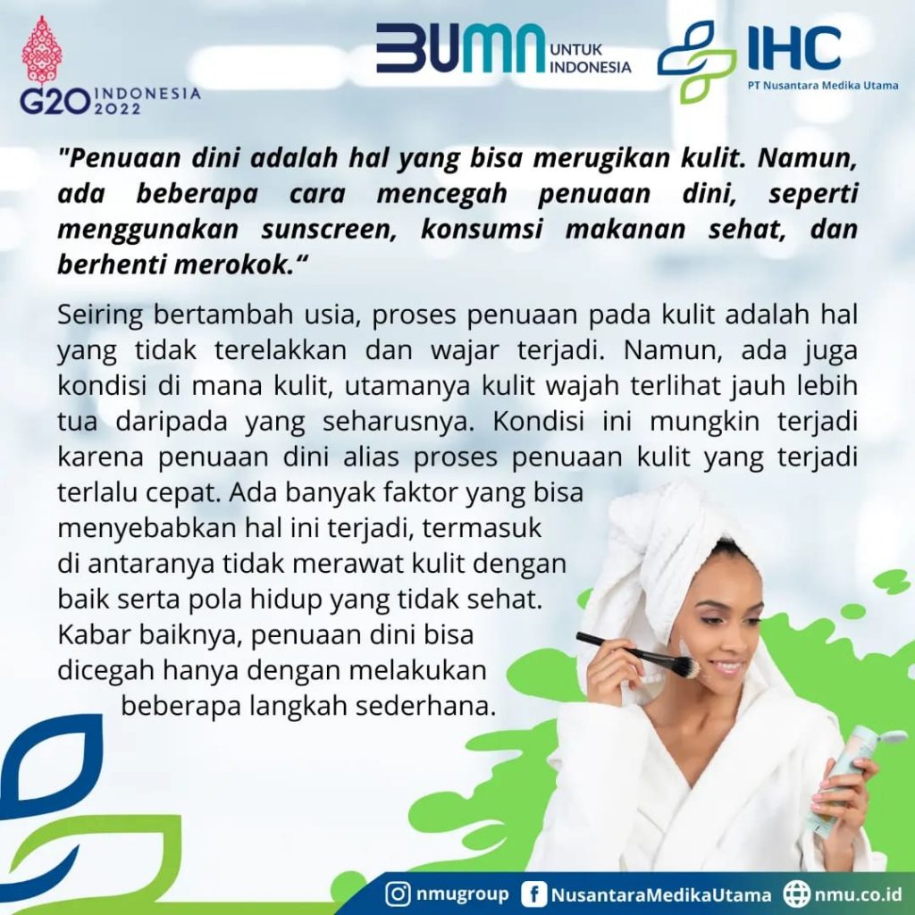 Penuaan dini adalah hal yang bisa merugikan kulit. Namun, ada beberapa cara mencegah penuaan dini, seperti menggunakan sunscreen, konsumsi makanan sehat, dan berhenti merokok.