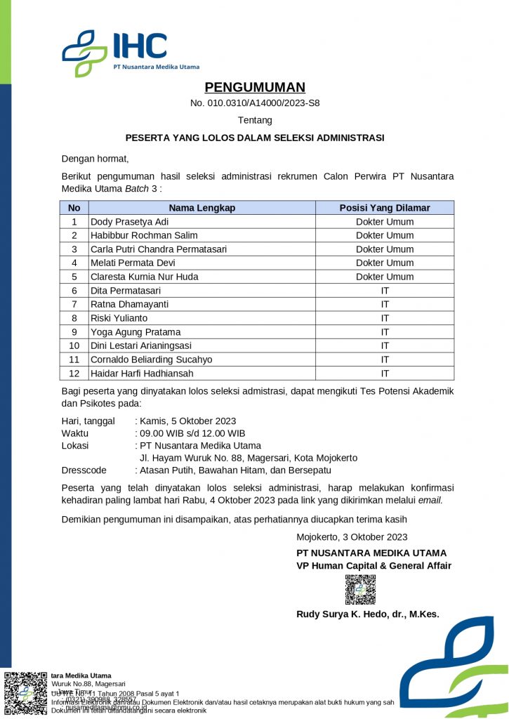 Berikut kami sampaikan pengumuman hasil tes wawancara rekrutmen calon pekerja PT Nusantara Medika Utama Batch 3 dengan hasil terlampir: