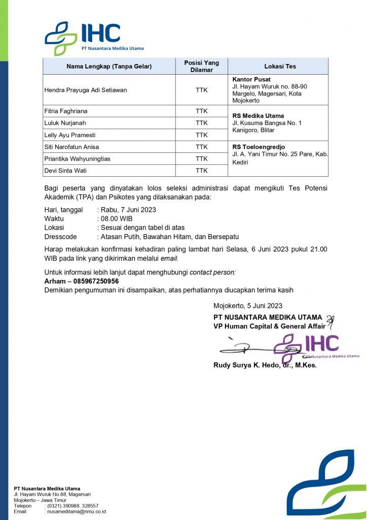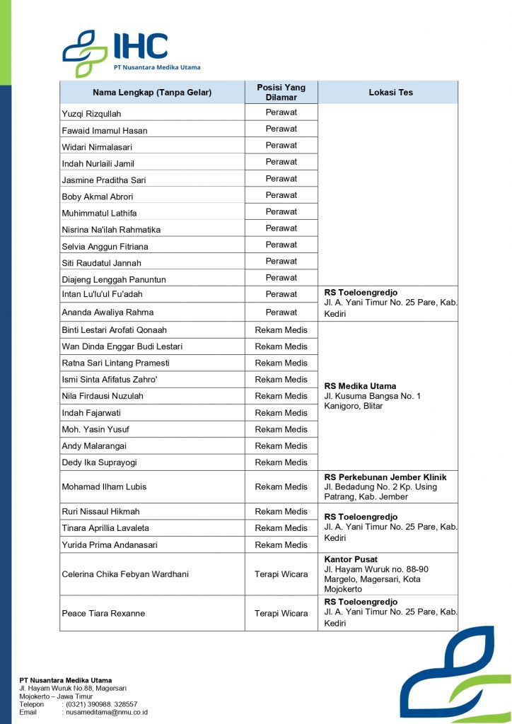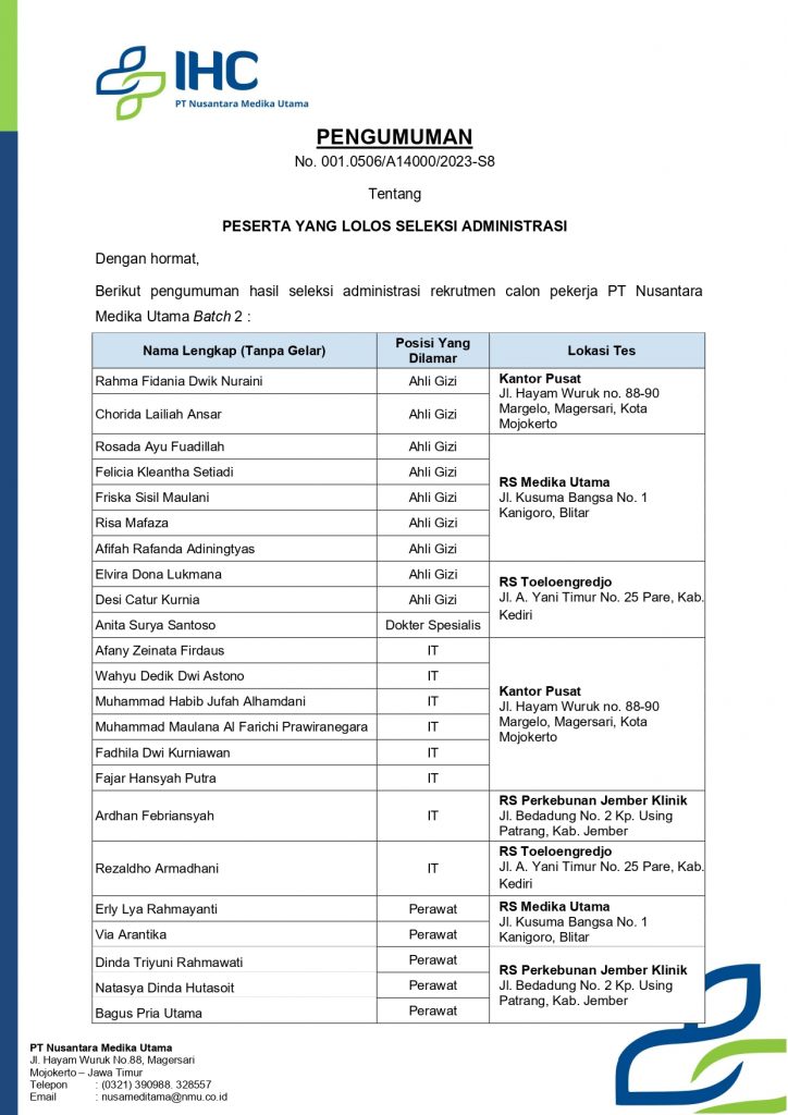 Berikut kami sampaikan pengumuman hasil tes wawancara rekrutmen calon pekerja PT Nusantara Medika Utama Batch 2 dengan hasil terlampir: