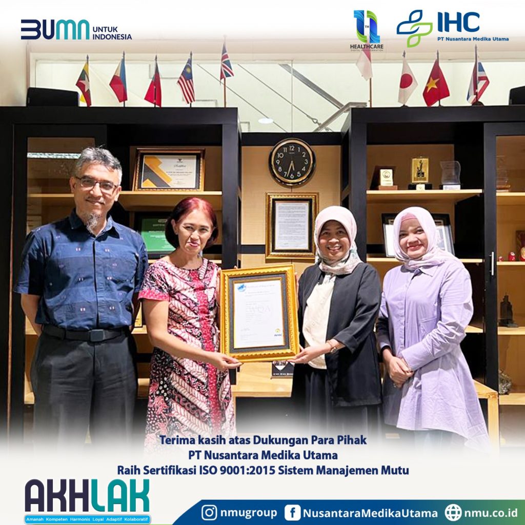 Puji Syukur atas anugerah Tuhan yang Kuasa, di awal tahun 2024 PT Nusantara Medika Utama kembali menorehkan prestasi penghargaan ISO 9001:2015 Sistem Manajemen Mutu sebagai Penyedia Layanan Jasa Kesehatan yang dikeluarkan oleh badan sertifikasi dunia Worlwide Quality Assurrance Ltd (WQA) . Hal ini merupakan bagian ikhtiar dan komitmen Perusahaan untuk terus melakukan perbaikan berkelanjutan untuk mewujudkan visi dan misi perusahaan.